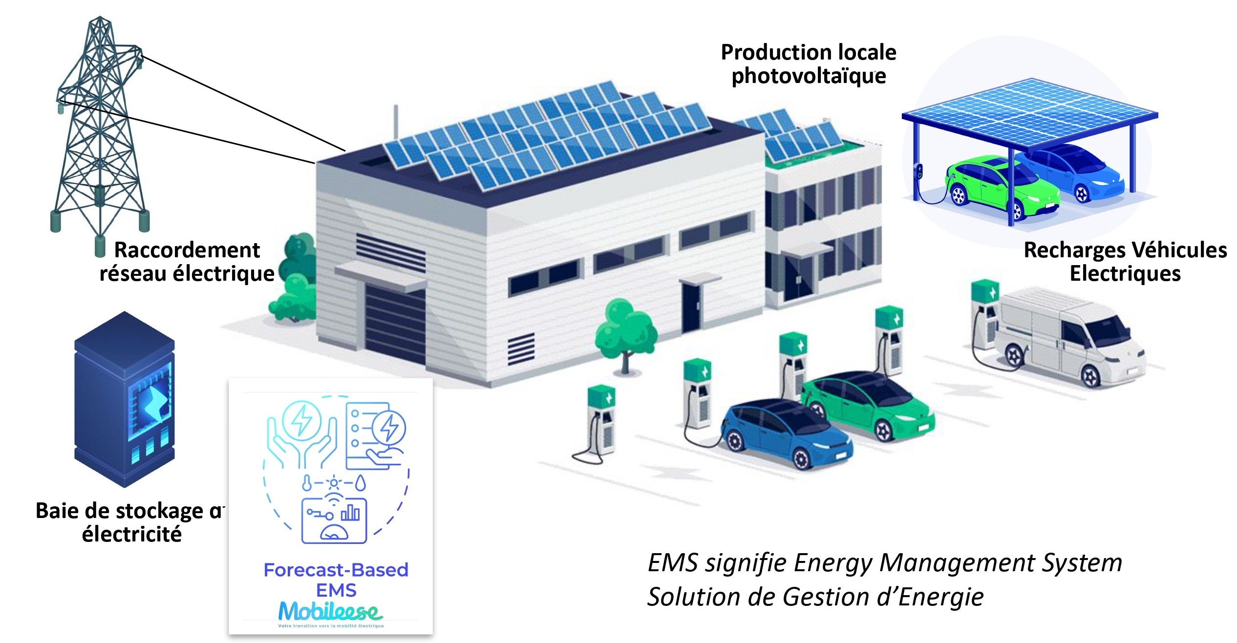 Nous avons développé une solution de gestion d’énergie (Energy Management System) qui gère sur votre site les bornes de recharge, la consommation du bâtiment, la production photovoltaïque et le stockage d’électricité.